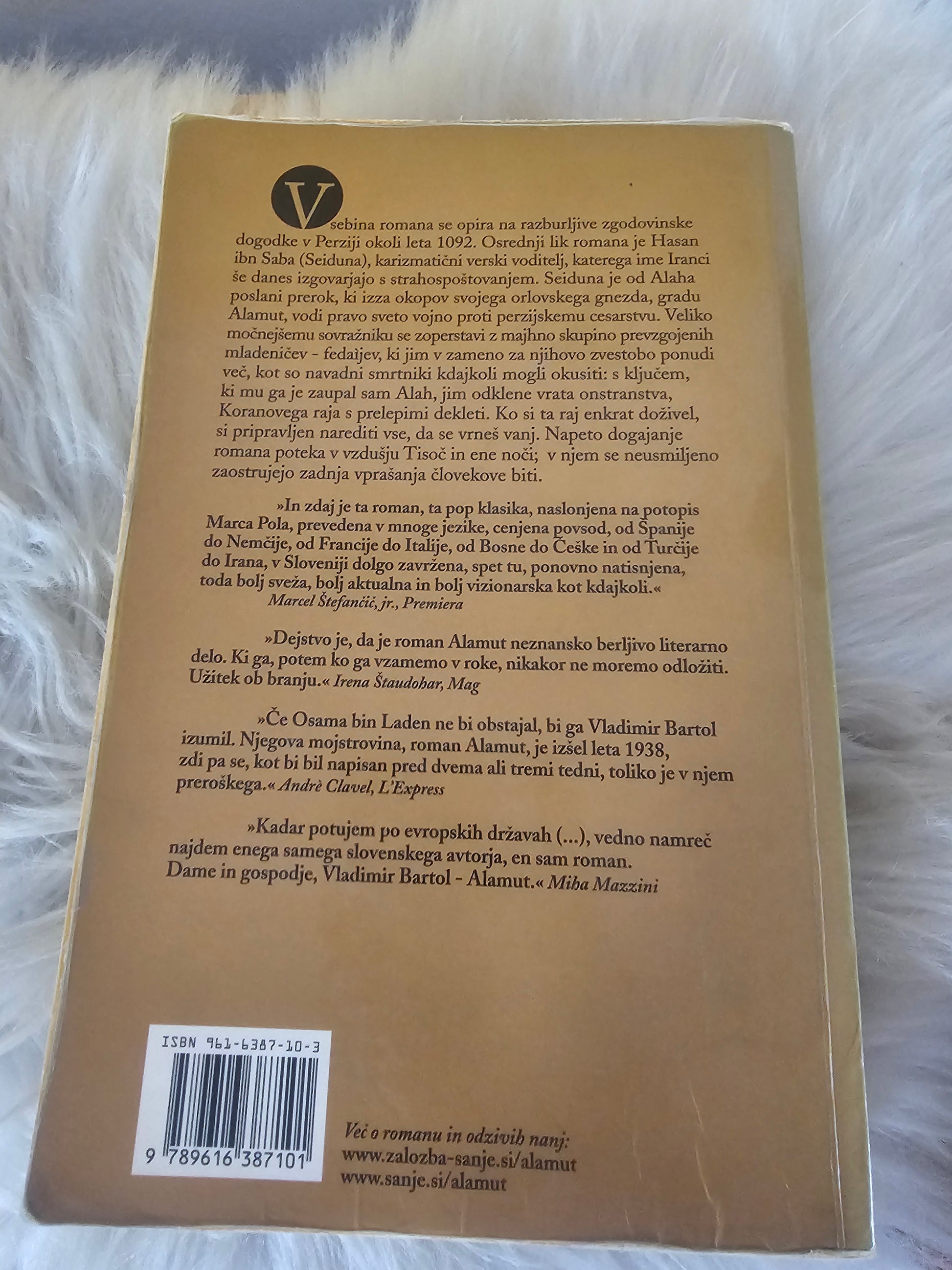 Alamut je zgodovinski roman, ki opisuje muslimanski svet, v katerem je Perzijo z vzhodnim svetom sutiskih muslimanov zaznamoval imperij seldžusških Turkov, muslimanski zahod pa šiitska dinastija Fatimidov s sedežem v Kairu. Roman opisuje načelo, da je v svetu brez Boga dovoljeno vse, tako je dovoljeno fantastično izrabljanje oblasti in religije, ter ubijanje v njunem imenu. Roman sestavlja 21. poglavij in celotna snov je zgodovinska verna, avtor pa uporablja podobe živih oseb.