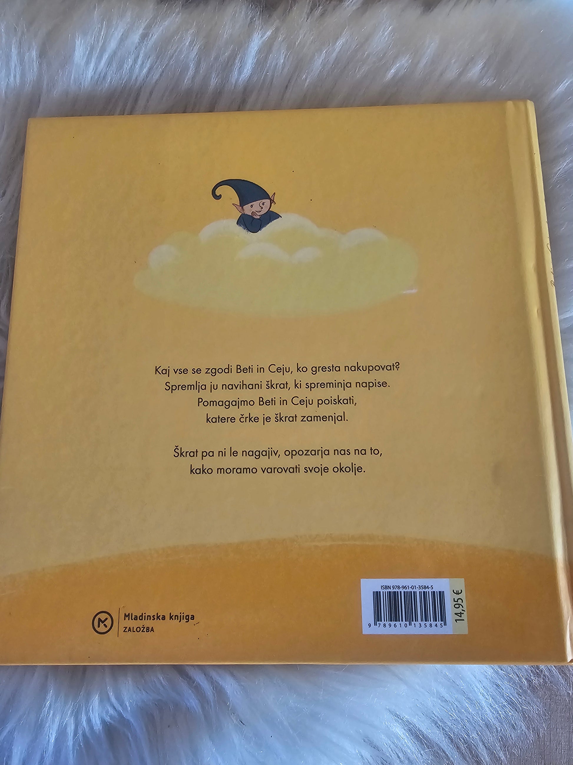 Spremlja ju navihani škrat, ki spreminja napise. Tako se mali bralec-gledalec ob ilustracijah zabava tudi ob iskanju številnih smešnih napak. Škrat pa ni le nagajiv. Sproti nas nevsiljivo poučuje, kako lahko varujemo okolje, tudi ko nakupujemo.