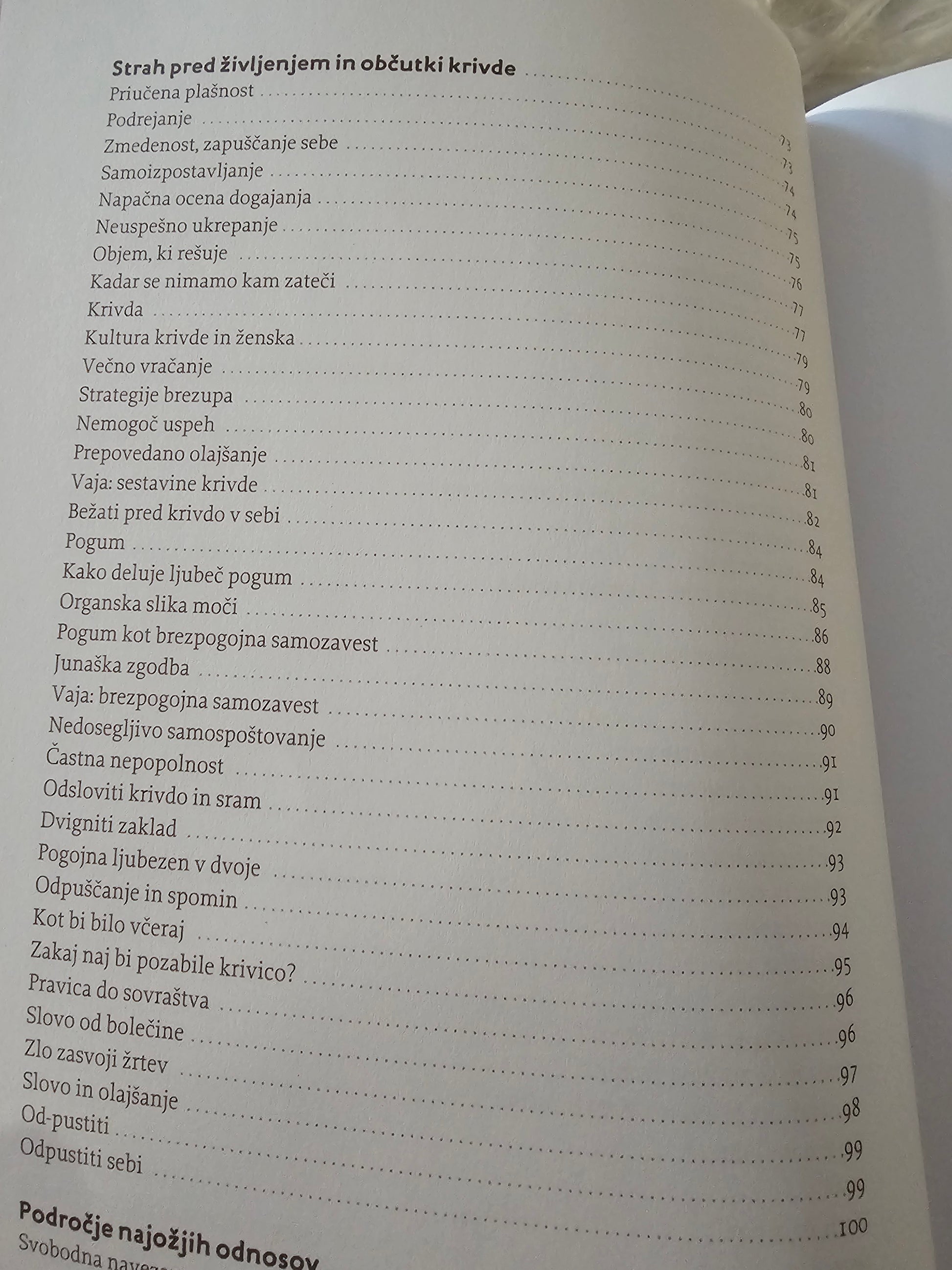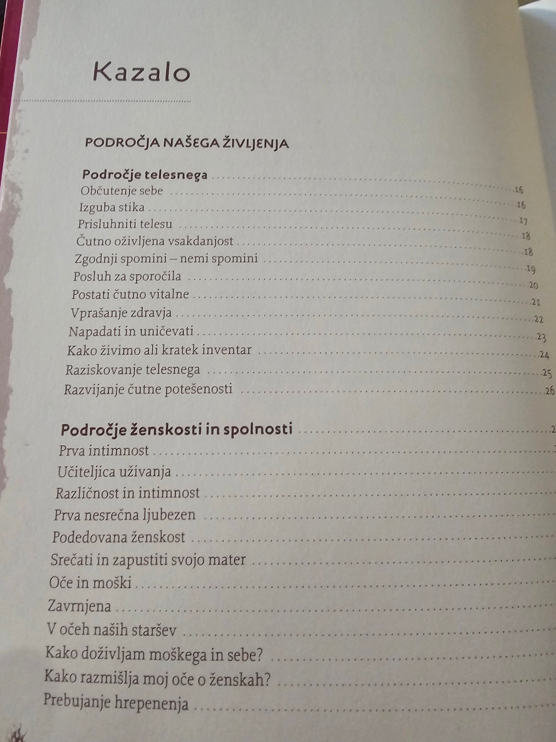 Knjiga se začenja s telesnim in čutnim doživljanjem, ki ju postavlja za temeljno orodje osrečujočih odnosov. Odkrito spregovori o ženskosti, prvih nesrečnih ljubeznih, intimnem občutenju in samovrednotenju. Obdela raznotere čustvene odzive – od upora, napadalnosti, jeze do strahu pred življenjem in občutkov krivde.