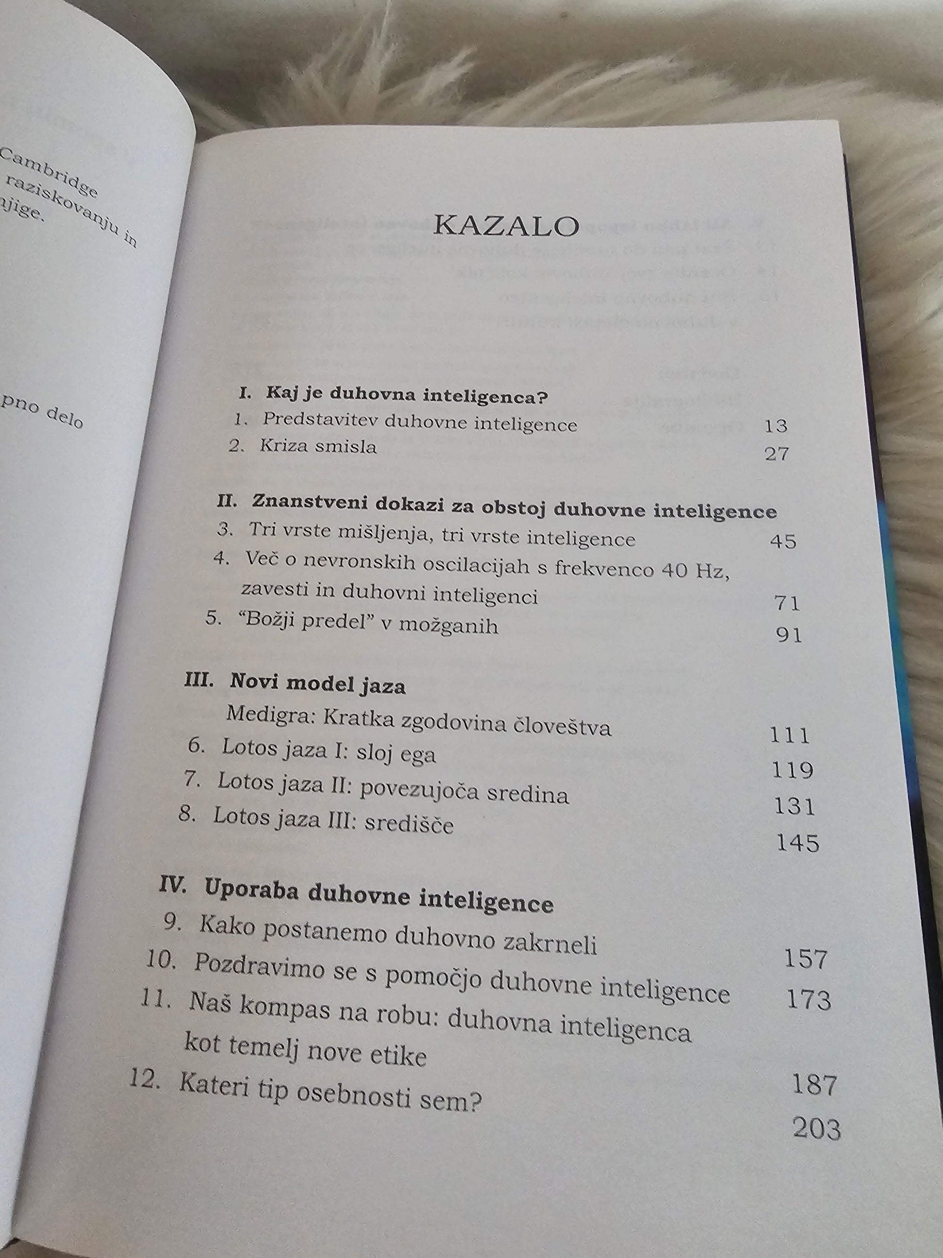 Z duhovno inteligenco razvijamo zmožnost za ustvarjanje smisla, vizij in vrednot ter sposobnost njihovega doživljanja. Omogoča nam, da lahko sanjamo in k nečemu težimo. Prav na duhovni inteligenci temeljijo naša prepričanja, vloga prepričanj in vrednot pri naših dejanjih ter pri oblikovanju našega življenja. Avtorja izhajata iz starodavnih modrosti, ki so bile duhovno bogate in še močno vplivajo na današnji čas…