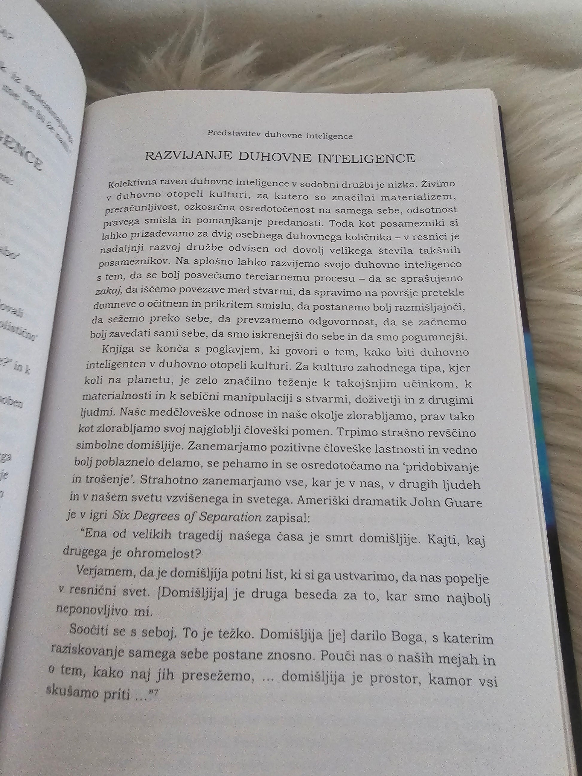 Za razliko od razumske inteligence, ki jo premorejo računalniki, in čustvene inteligence, ki je lastnost višjih sesalcev, je duhovna inteligenca – biti kreativen, strpen, sposoben spreminjati pravila in situacije, spraševati se, kdo smo in odkod – lastna samo človeku in kot dejavnik, ki povezuje prvi dve, najbistvenejša od vseh treh.