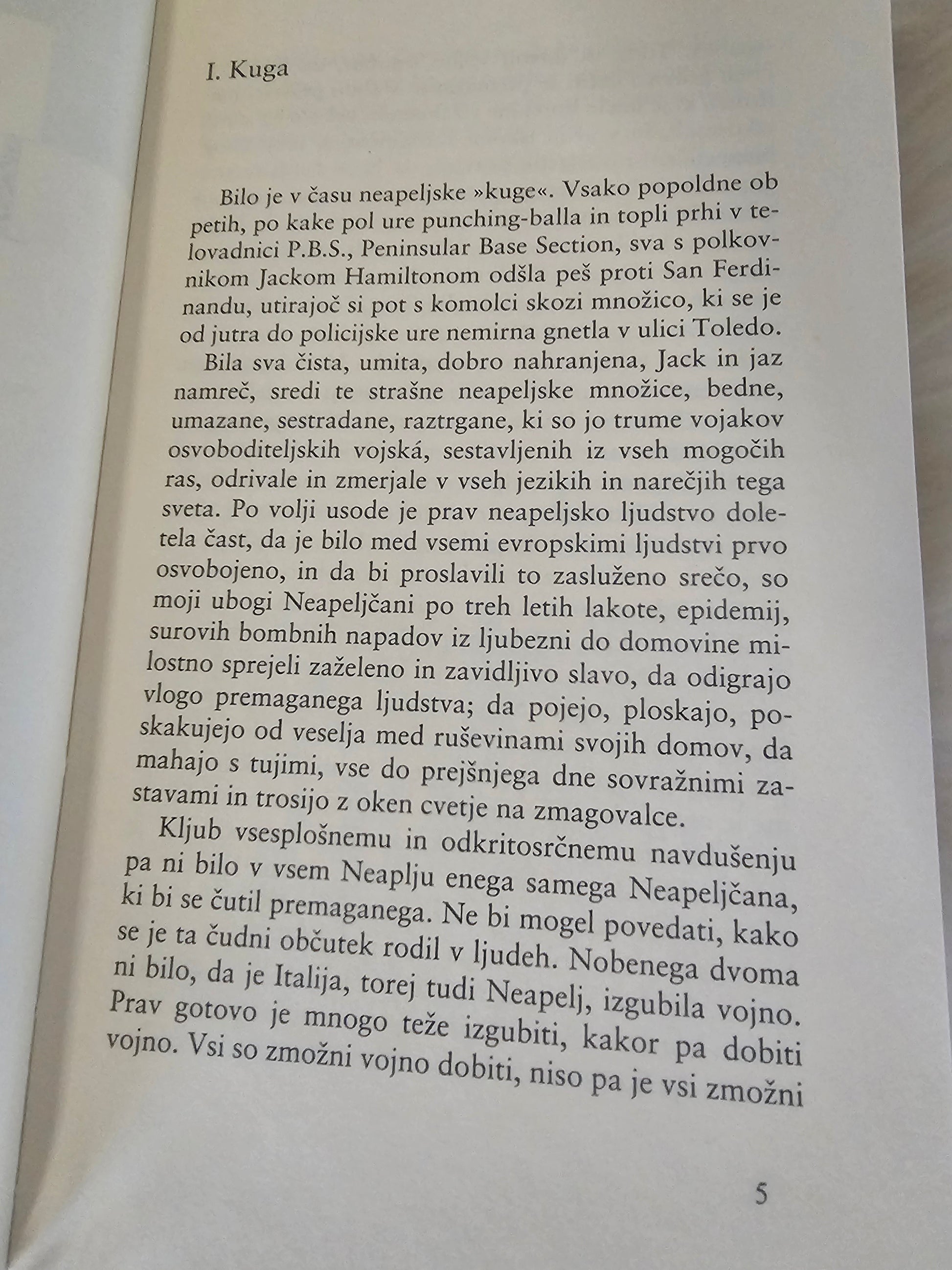 Knjiga se odvija v Neaplju med drugo svetovno vojno in raziskuje posledice vojne na človeško psiho in družbo. Avtor opisuje propad morale, etike in človečnosti, ki ga prinaša vojna, ter prikazuje groteskne in absurdne situacije, s katerimi se soočajo vojaki in civilisti. V ospredju so zgodbe o preživetju, ponižanju in prilagajanju v svetu, kjer so tradicionalne vrednote porušene. Knjiga je znana po svojem surovem in provokativnem slogu ter močni kritiki vojne in človeške narave.