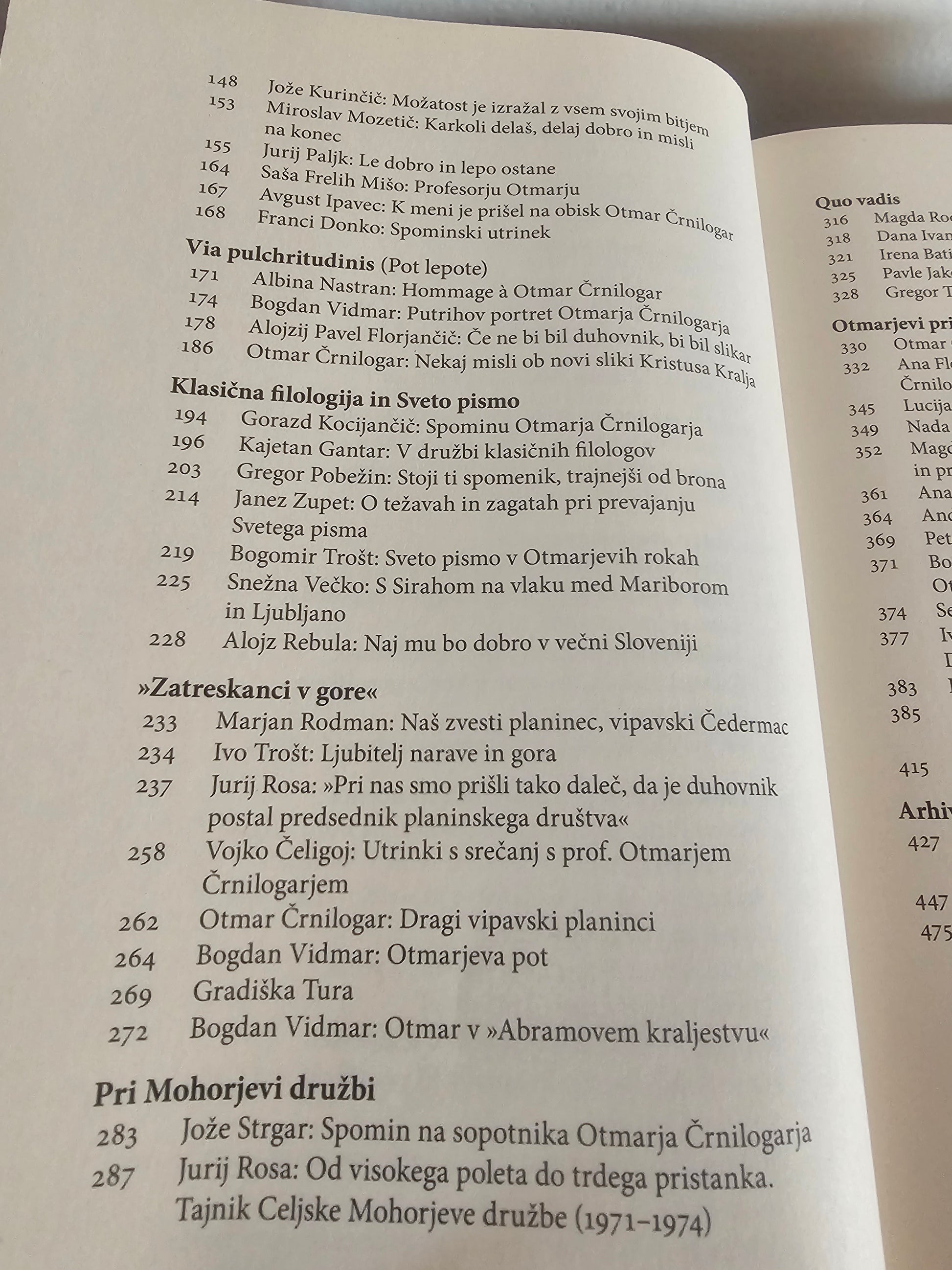Kal za zbornik o Otmarju Črnilogarju je pognala leta 2006, ob odkritju spomenika, posvečenega nekdanjemu podraškemu župniku. Na slovesnosti leta 2007, ko bi Črnilogar praznoval zlato mašo in štiridesetletnico prihoda v Podrago, se je zbralo okrog 600 Otmarjevih sorodnikov, sodelavcev, vaščanov, znancev, občudovalcev in prijateljev iz mnogih slovenskih in zamejskih krajev, in ob številnih srečanjih je postalo jasno, da bi bila osebnost prof. Črnilogarja vredna podrobnejše obravnave in njegovo delo solidne predstavitve javnosti. Ob praznovanju Črnilogarjeve 80-letnice leta 2011 je nastal uredniški odbor, plod njegovega dela pa je bil zbornik s 60 prispevki 47 avtorjev, ki je izšel leta 2013. Spomin na velikega filologa in teologa pa ostaja živ. Sedaj v ponatisnjeni ter dopolnjeni izdaji 72 zapisov 60 avtorjev o življenju in delu Otmarja Črnilogarja z obširno bibliografijo ponovno ponujamo slovenskemu bralstvu.( kopirano s spleta).