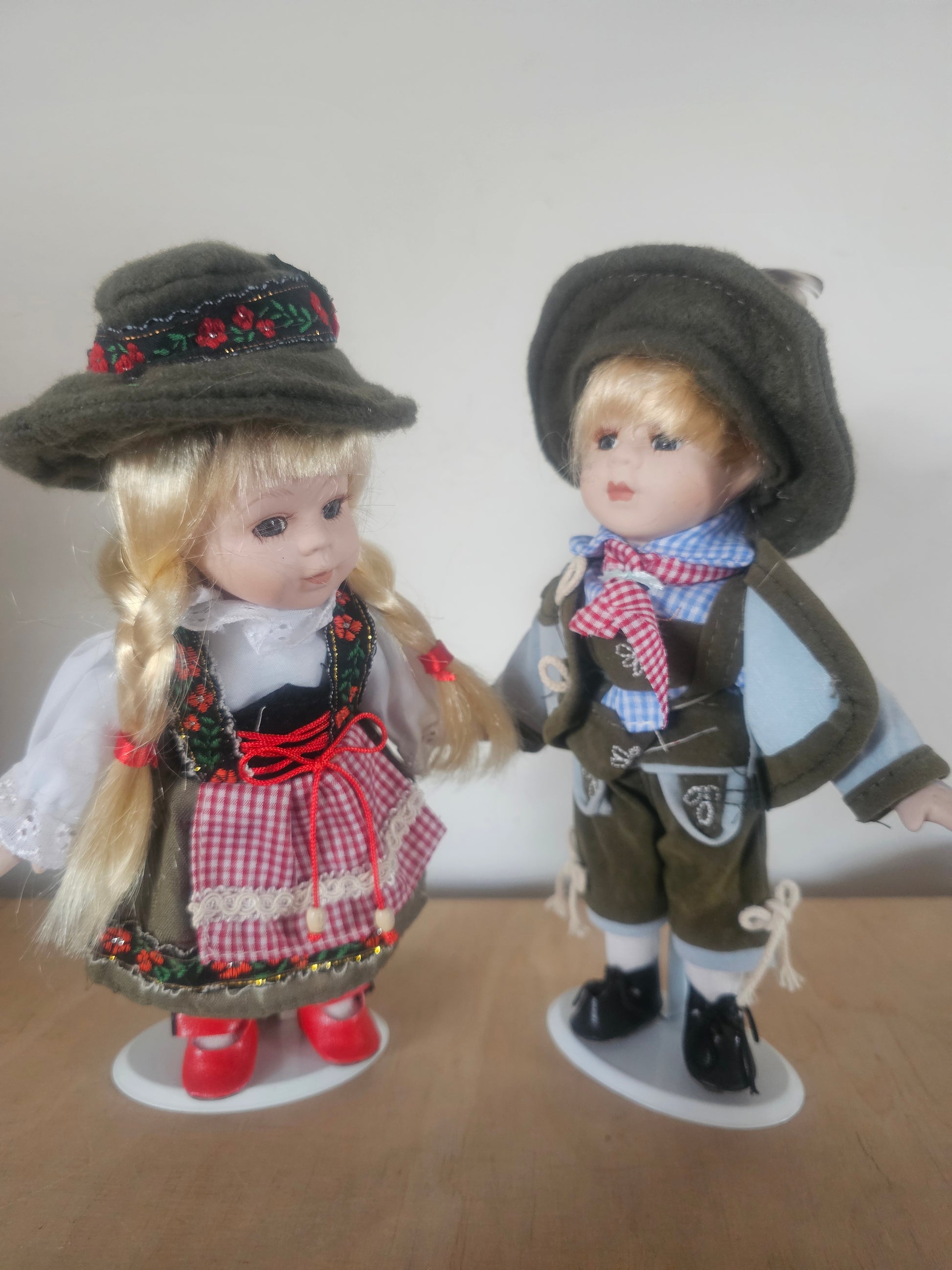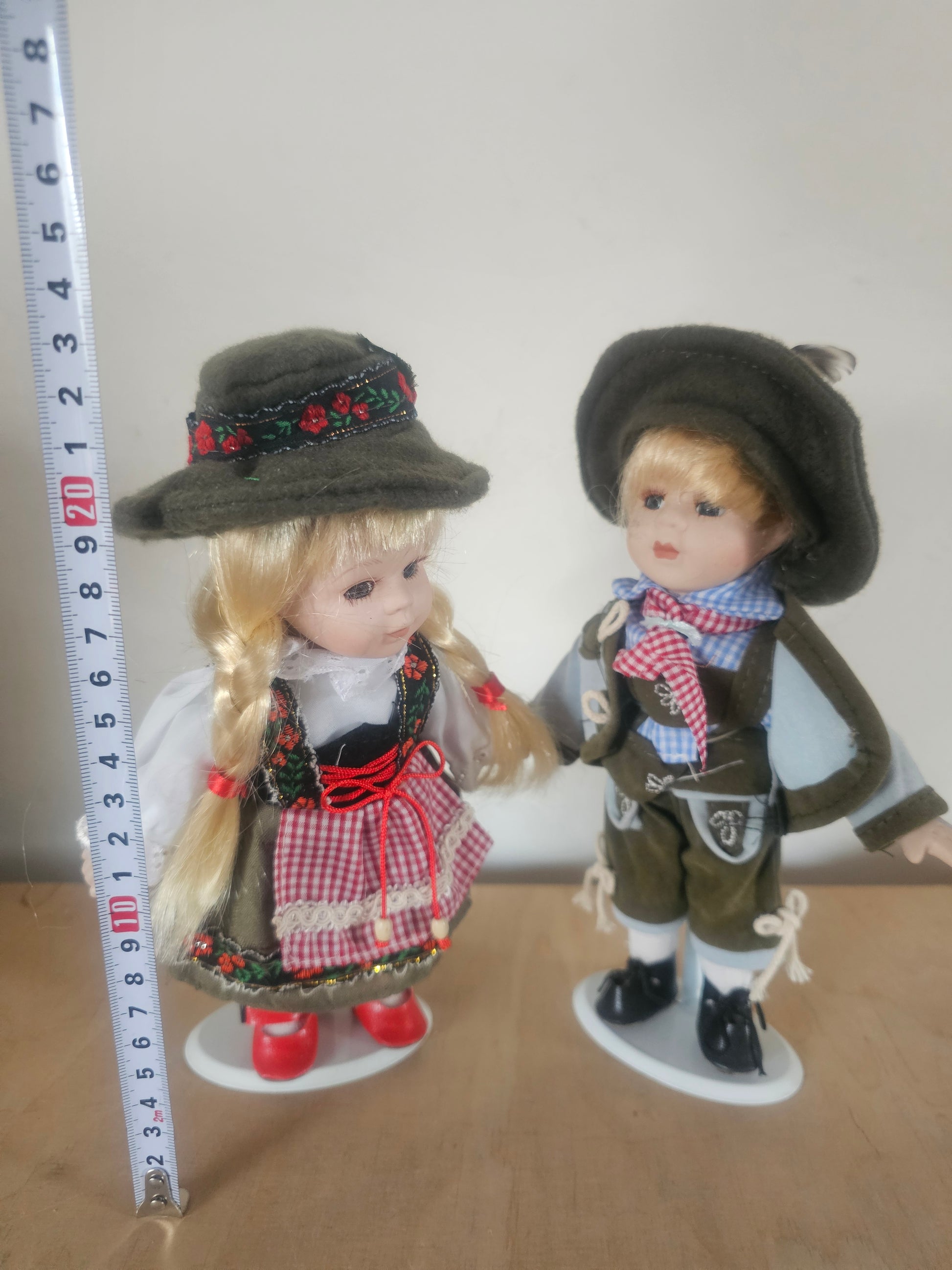 Obe lutki delujeta kot zbirateljski ali dekorativni figuri, oblečeni v tradicionalna alpska oziroma bavarska oblačila.