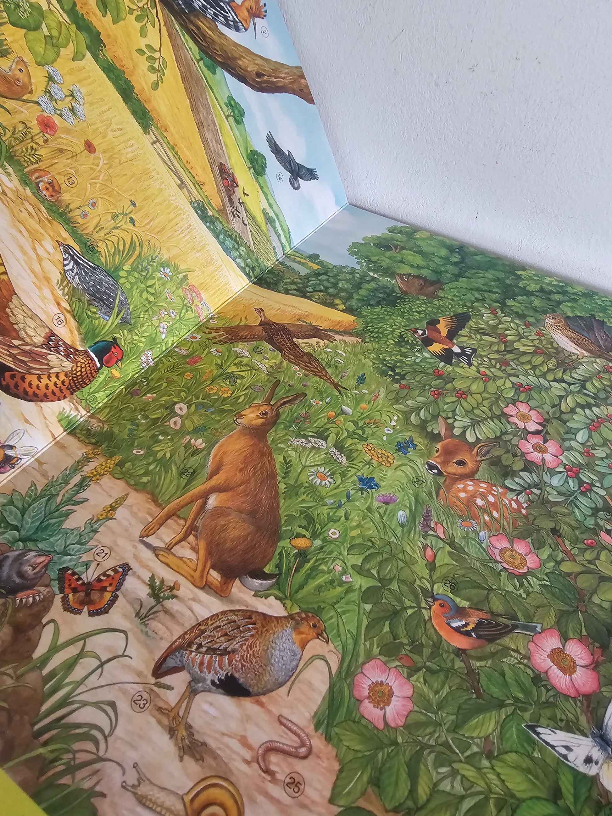 Naj bo na robu polja, v gozdu, ob ribniku ali v temni noči- v tej čudoviti knjigi se na vsaki strani skriva več kot 30 živali.