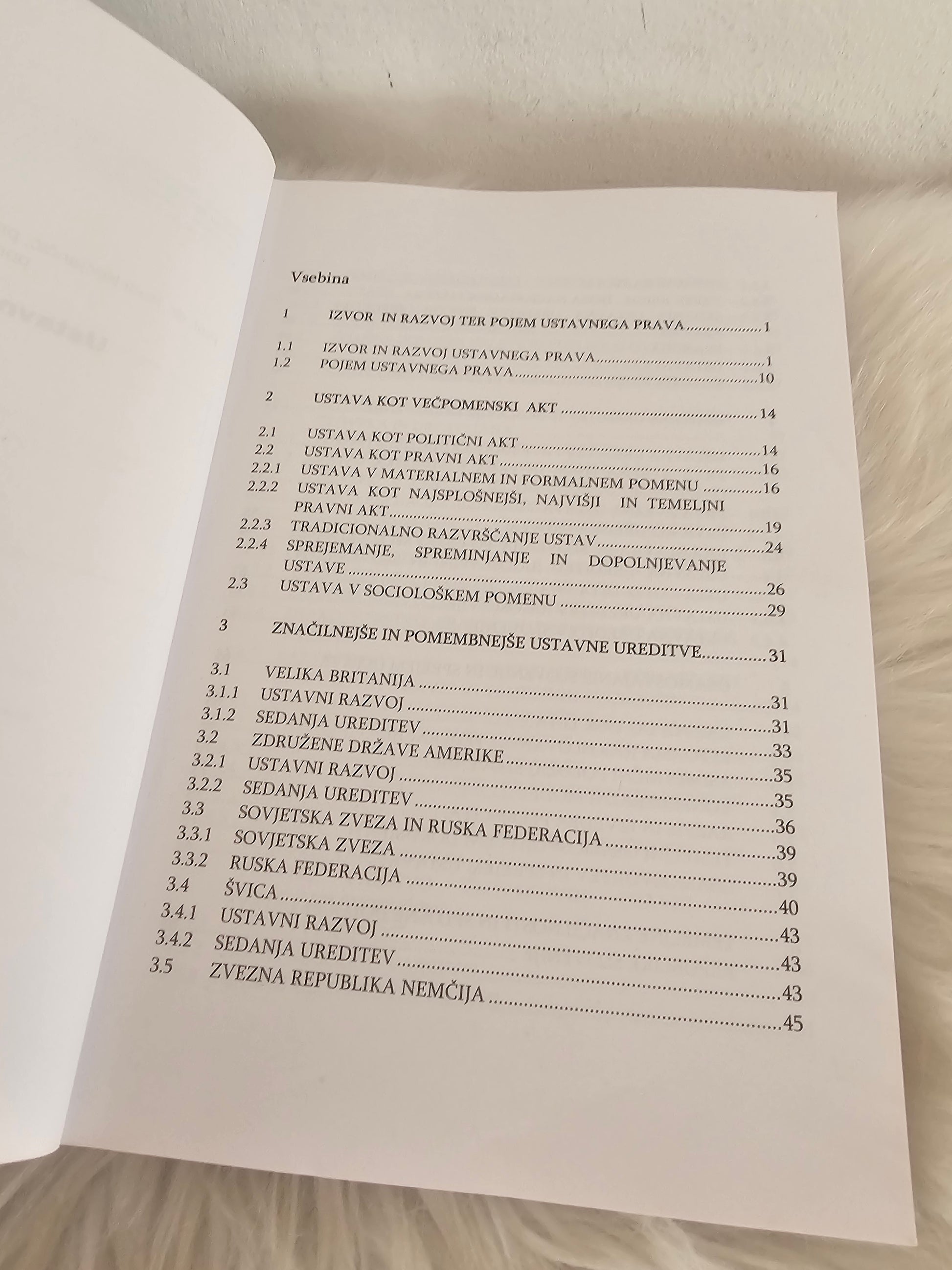 Učbenik vsebuje dva dela: splošni in posebni del. V splošnem delu pisci prikažejo izvor in razvoj ustavnega prava ter opredelijo temeljne pojme in institute ustavnega prava s poudarkom na ustavi kot večpomenskem aktu. Predstavijo tudi najpomembnejše in najznačilnejše ustavne ureditve v svetu. V posebnem delu izčrpno prikažejo in utemeljijo ustavno ureditev v Sloveniji, s podrobno in izčrpno opredelijo veljavne ustave V učbeniku je ustava predstavljena po svoji nomotehnični sistematiki. Posebno pozornost namenijo človekovim pravicam in temeljnim svoboščinam s poudarkom na njihovem pravnem varstvu. Prikaz zaokrožijo z obravnavo gospodarskih in socialnih razmerij.
