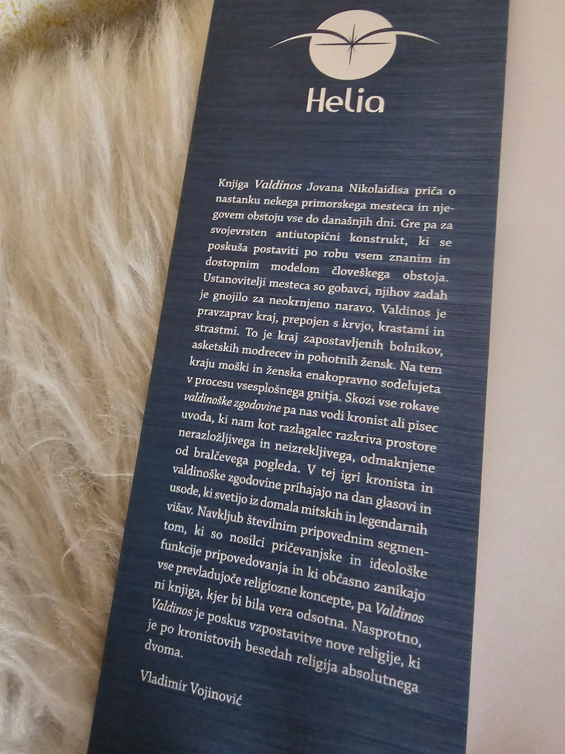 Knjiga Valdinos Jovana Nikolaidisa priča o nastanku nekega primorskega mesteca in njegovem obstoju vse do današnjih dni. Gre pa za svojevrsten antiutopični konstrukt, ki se poskuša postaviti po robu vsem znanim in dostopnim modelom človeškega obstoja. Ustanovitelji mesteca so gobavci, njihov zadah je gnojilo za neokrnjeno naravo. Valdinos je pravzaprav kraj, prepojen s krvjo, krastami in strastmi. To je kraj zapostavljenih bolnikov, asketskih modrecev in pohotnih žensk. Na tem kraju moški in ženska enakopravno sodelujeta v procesu vsesplošnega gnitja. Skozi vse rokave valdinoške zgodovine pa nas vodi kronist ali pisec uvoda, ki nam kot razlagalec razkriva prostore nerazložljivega in neizrekljivega, odmaknjene od bralčevega pogleda. V tej igri kronista in valdinoške zgodovine prihajajo na dan glasovi in usode, ki svetijo iz domala mitskih in legendarnih višav. Navkljub številnim pripovednim segmentom, ki so nosilci pričevanjske in ideološke funkcije pripovedovanja in ki občasno zanikajo vse prevladujoče religiozne koncepte, pa Valdinos ni knjiga, kjer bi bila vera odsotna. Nasprotno, Valdinos je poskus vzpostavitve nove religije, ki je po kronistovih besedah religija absolutnega dvoma.