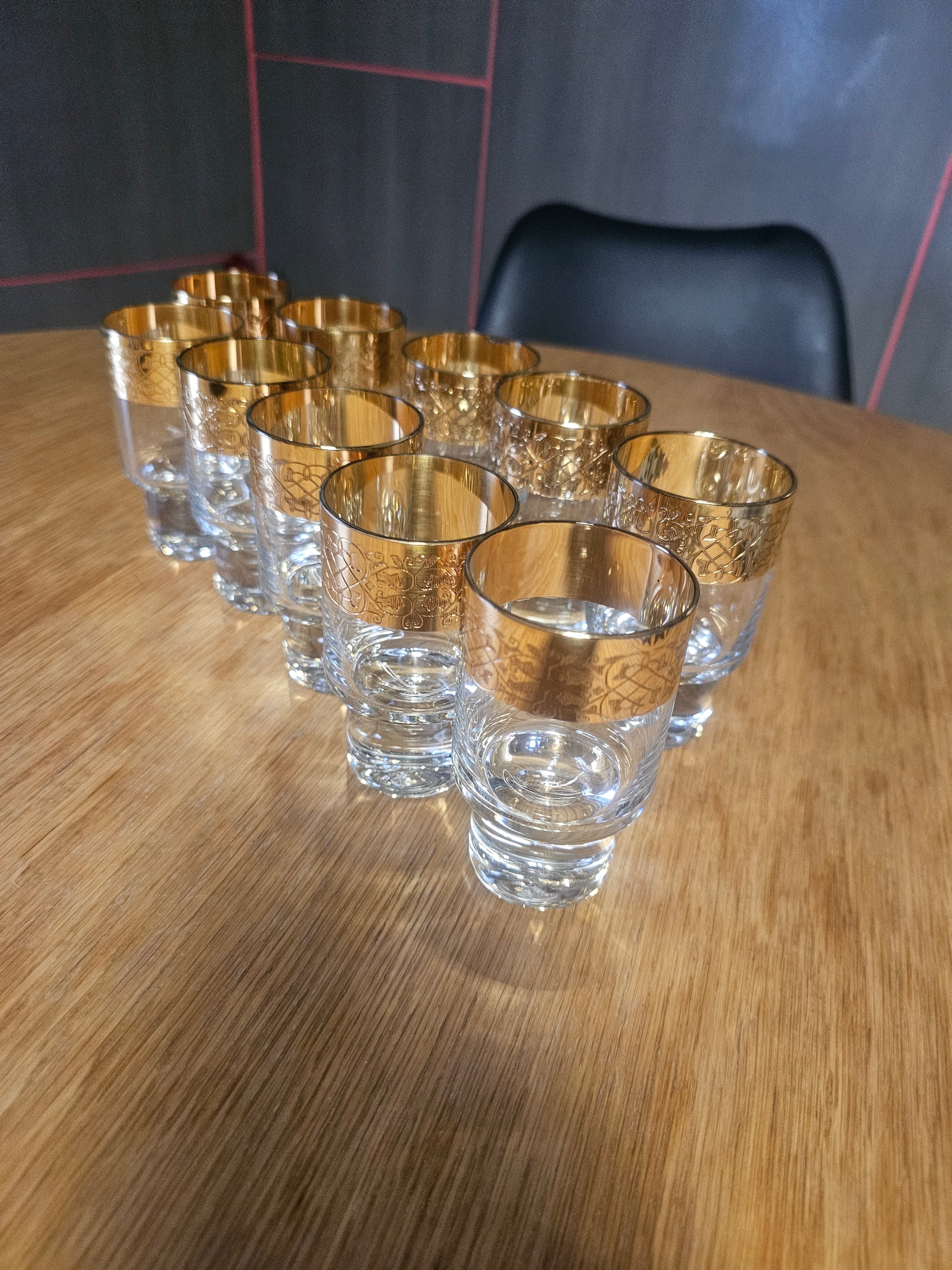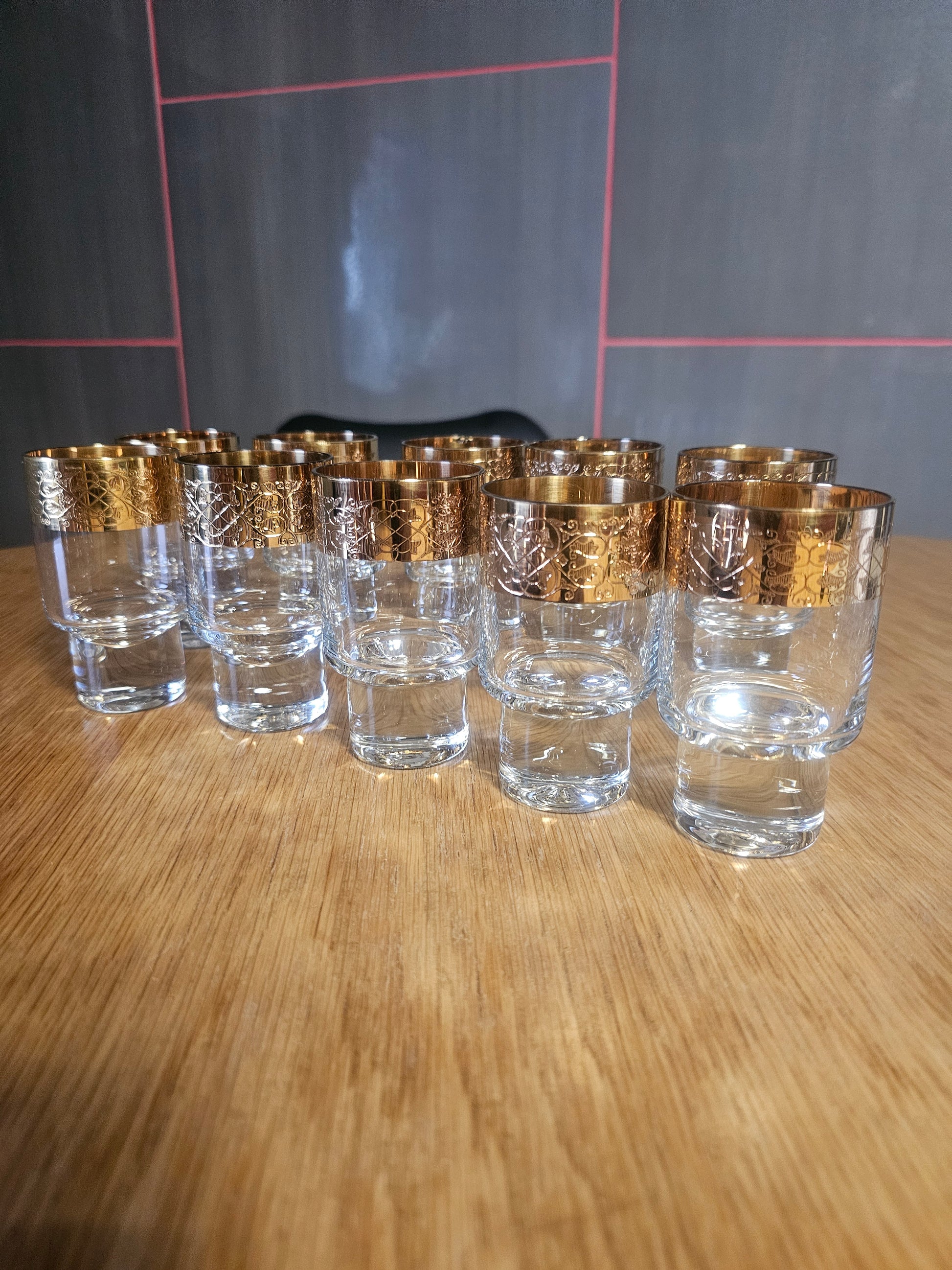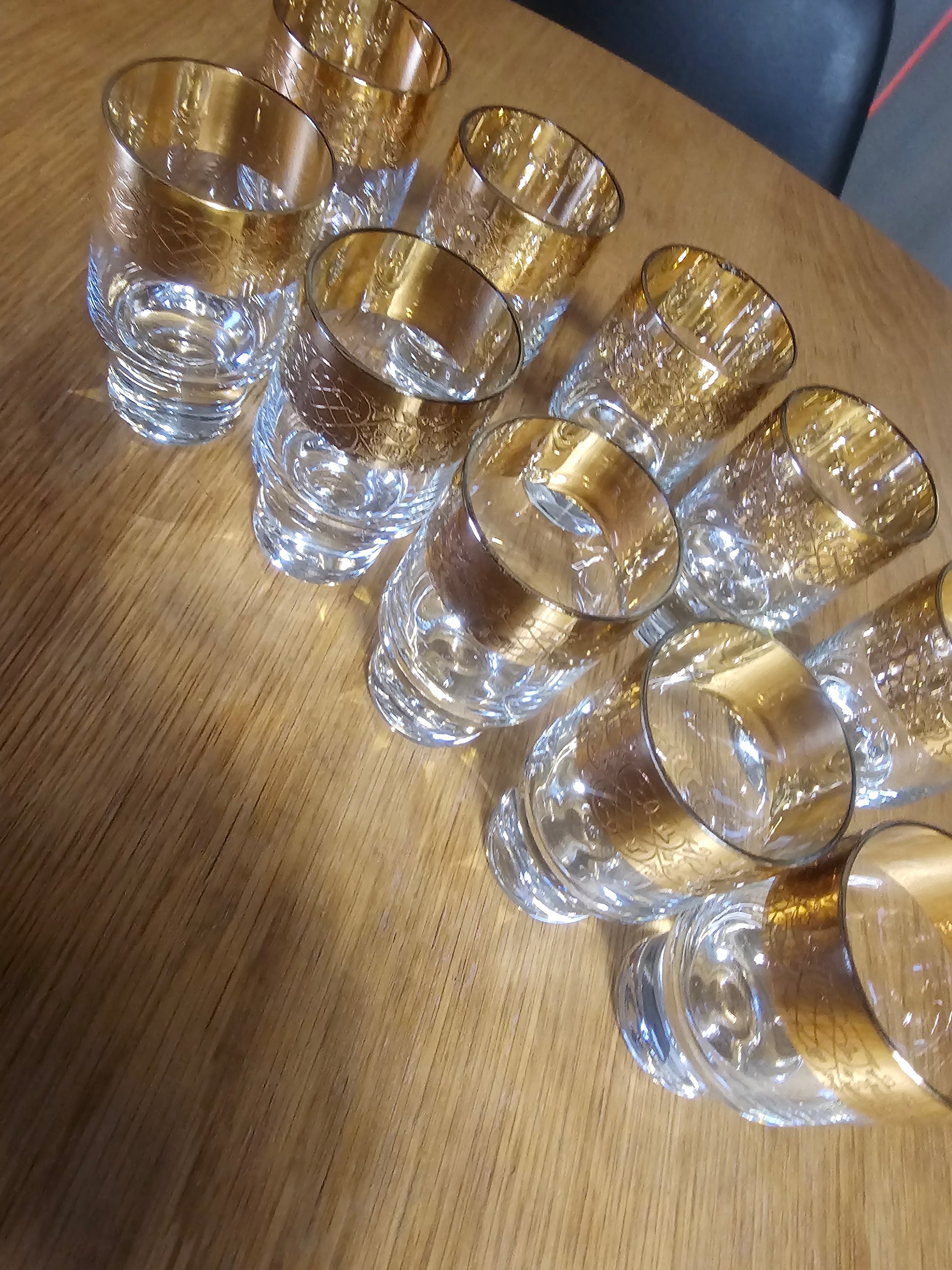 Prodam čudovit komplet 10 vintage kristalnih kozarcev z bogato zlato dekoracijo na zgornjem robu. Kozarci imajo masiven podstavek in elegantno obliko, značilno za kakovosten češki kristal (stil Bohemia).