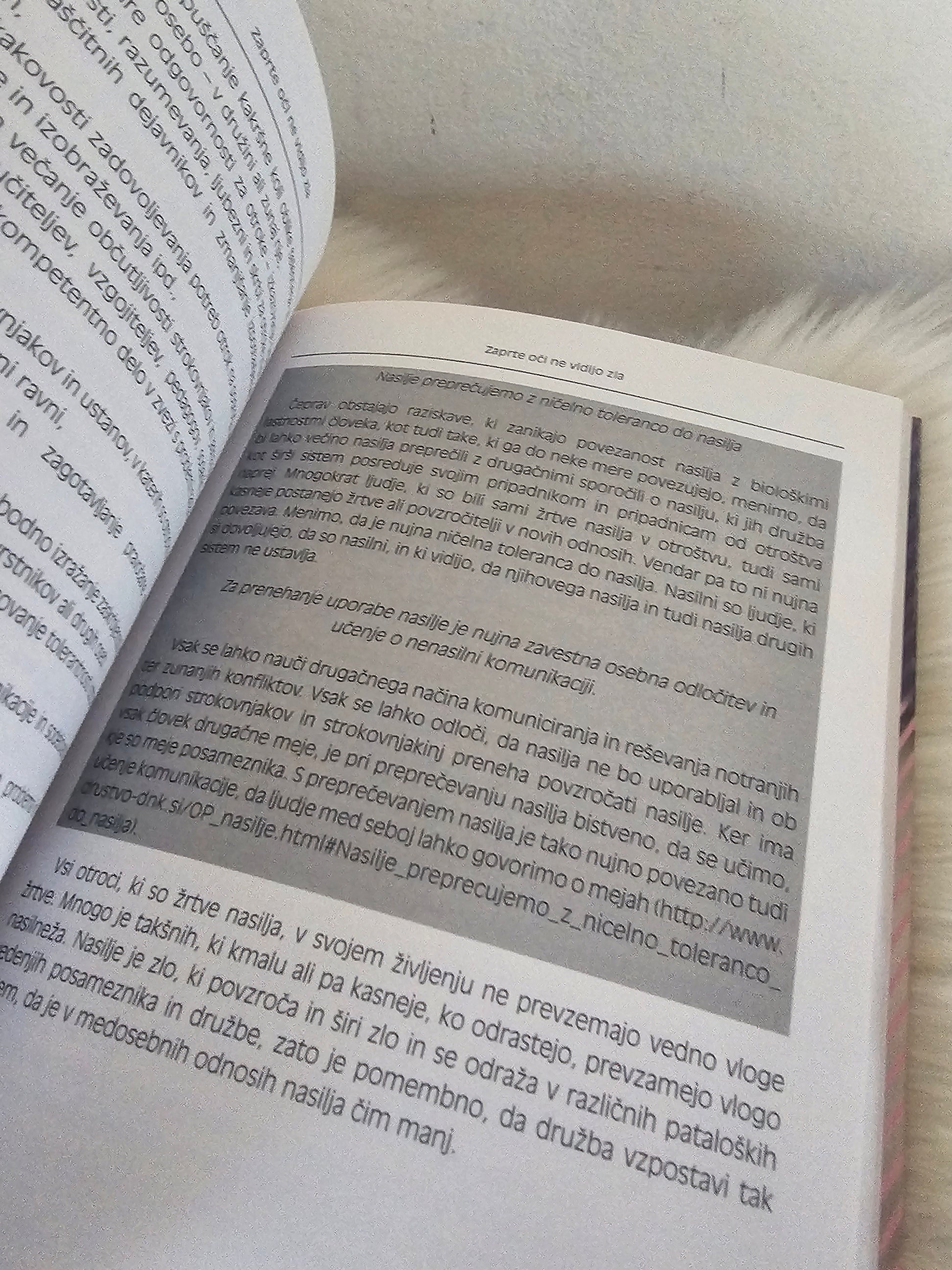 Avtorici se zavzemata za ničelno toleranco do nasilja in predlagata sistemski pristop pri preprečevanju nasilja, v katerega je vključena vsa družba – tako na institucionalni kot tudi na individualni ravni. Poseben pomen in poudarek dajeta šolam kot preventivnim organizacijam proti nasilju in predlagata takšen menedžment preventive proti nasilju v šoli, ki bi bil vključen v vse vzgojne programe vrtcev, šol, dijaških domov in drugih zavodov s področja vzgoje in izobraževanja. Z analizo primerov iz prakse in z izsledki raziskav prikažeta trpinčenje, zanemarjanje in spolno zlorabo otrok kot pomemben družbeni problem.
